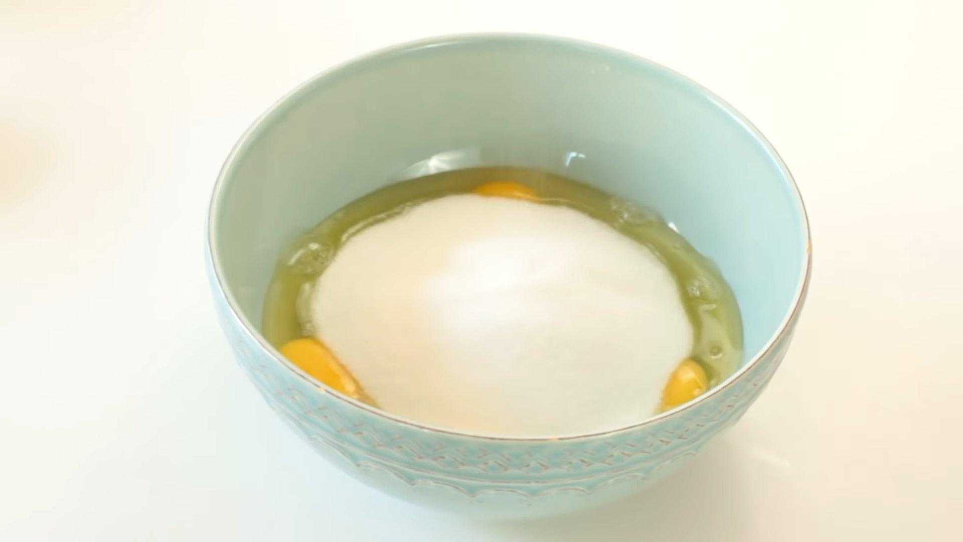 В глубокую миску разбиваем яйца, добавляем к ним сахар, соль и перемешиваем.