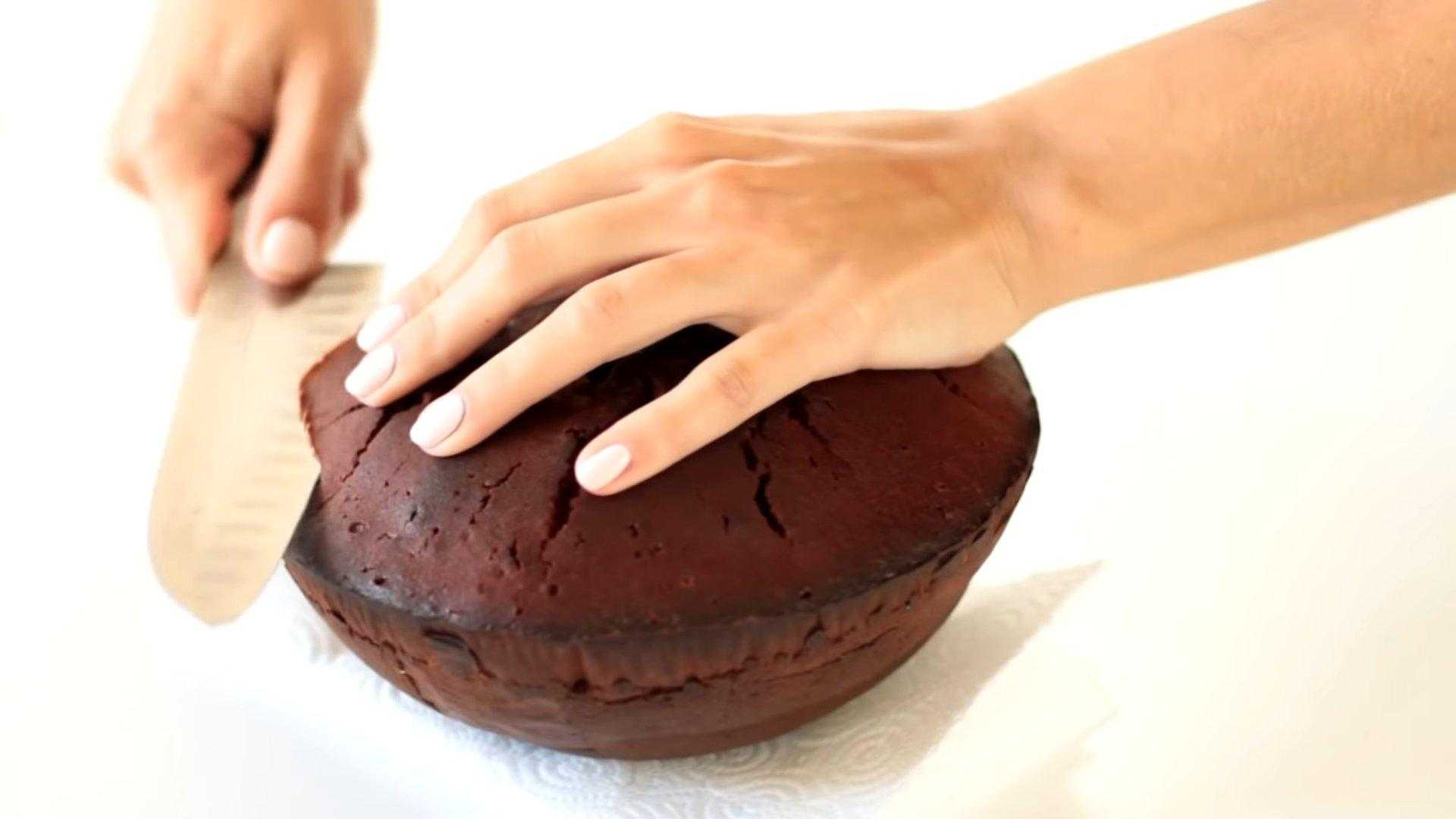 Готовый бисквит оставляем остывать. Затем при помощи ножа придаем ему форму человеческого мозга. Все обрезки откладываем, они нам еще понадобятся.