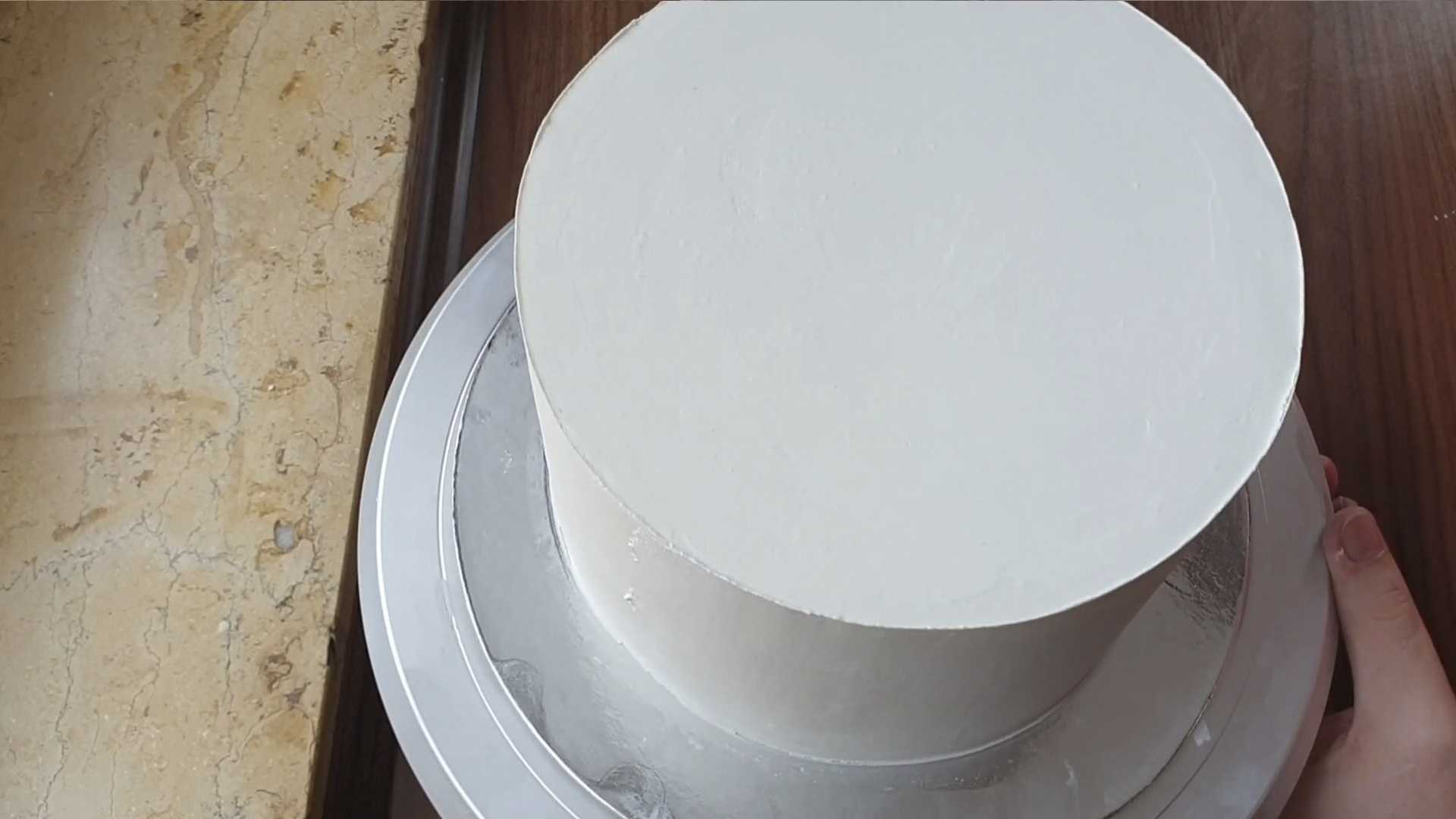 Приготовление позади. Впереди самое интересное — сборка торта. Кладем корж на подложку. Корж с обратной стороны можно смазать капелькой крема,так он прилипнет к подложке и не будет скользить.
