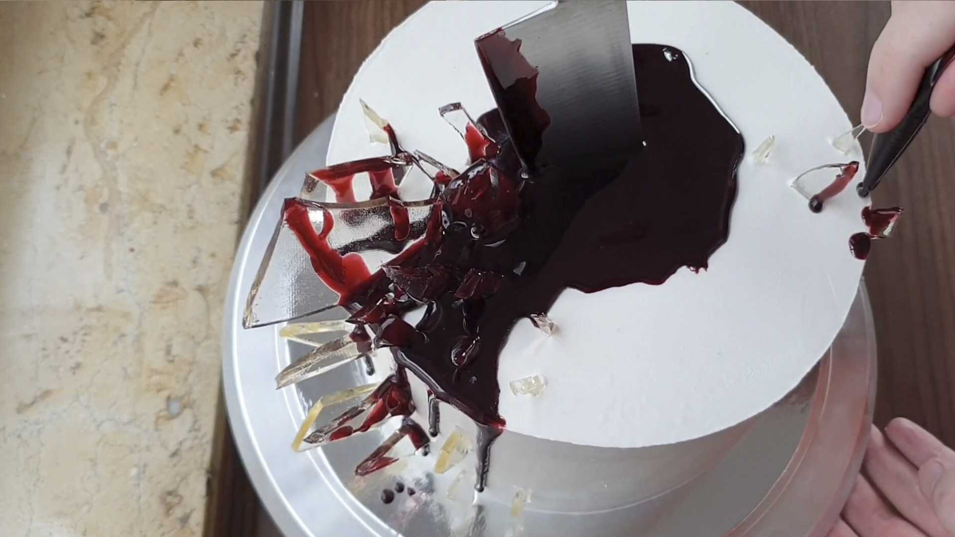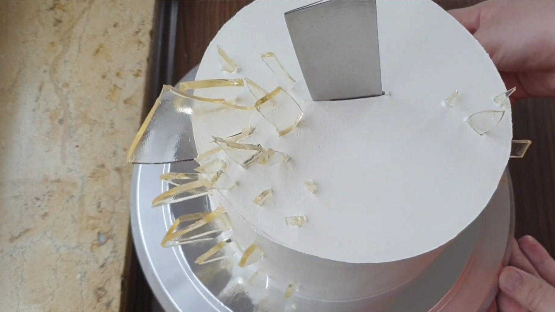 Достаем торт из холодильника и начинаем выкладывать карамельные осколки. В центр торта втыкаем большой кухонный нож.