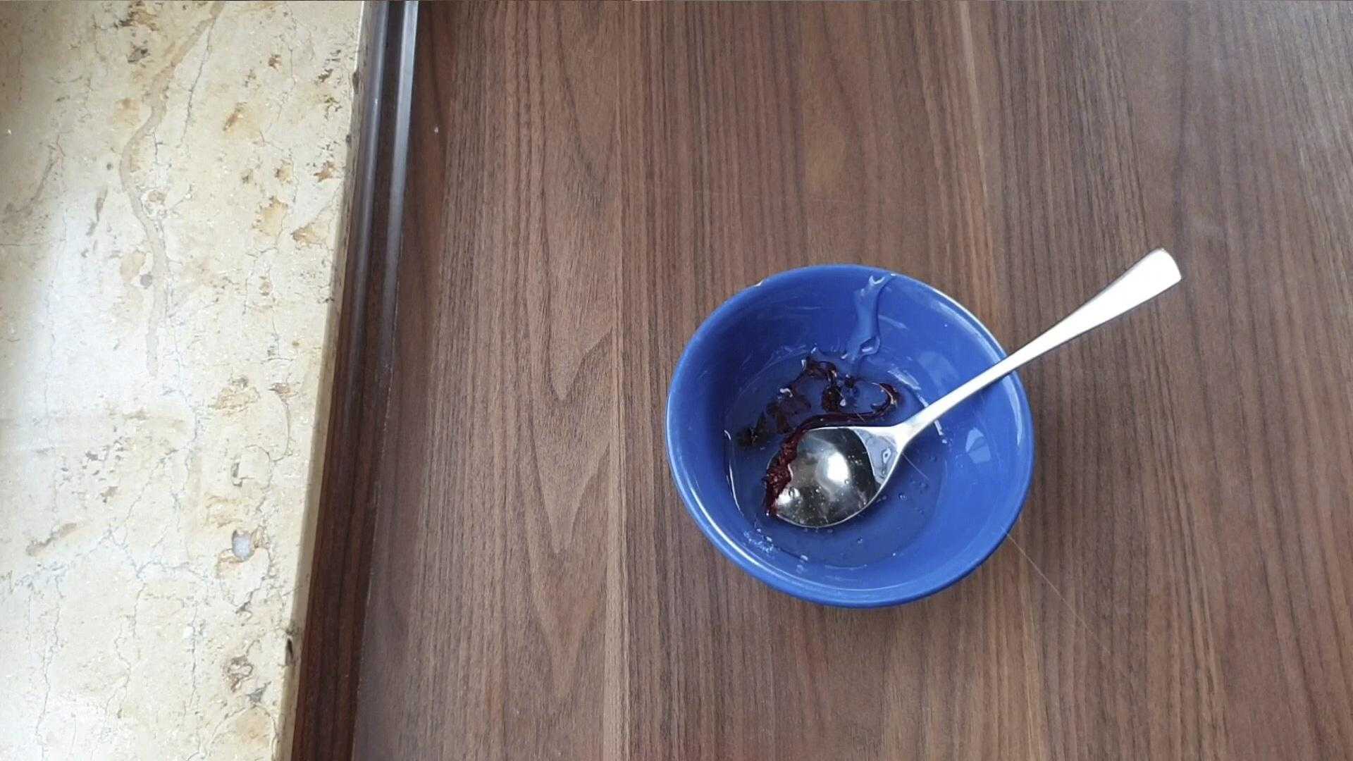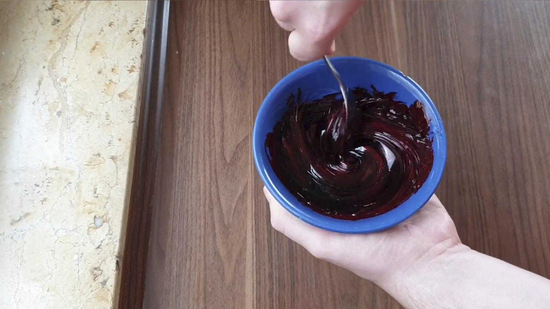 Далее приготовим искусственную кровь. Для этого оставшийся глюкозный сироп смешиваем с несколькими каплями гелевого пищевого красителя красного цвета и каплей синего.