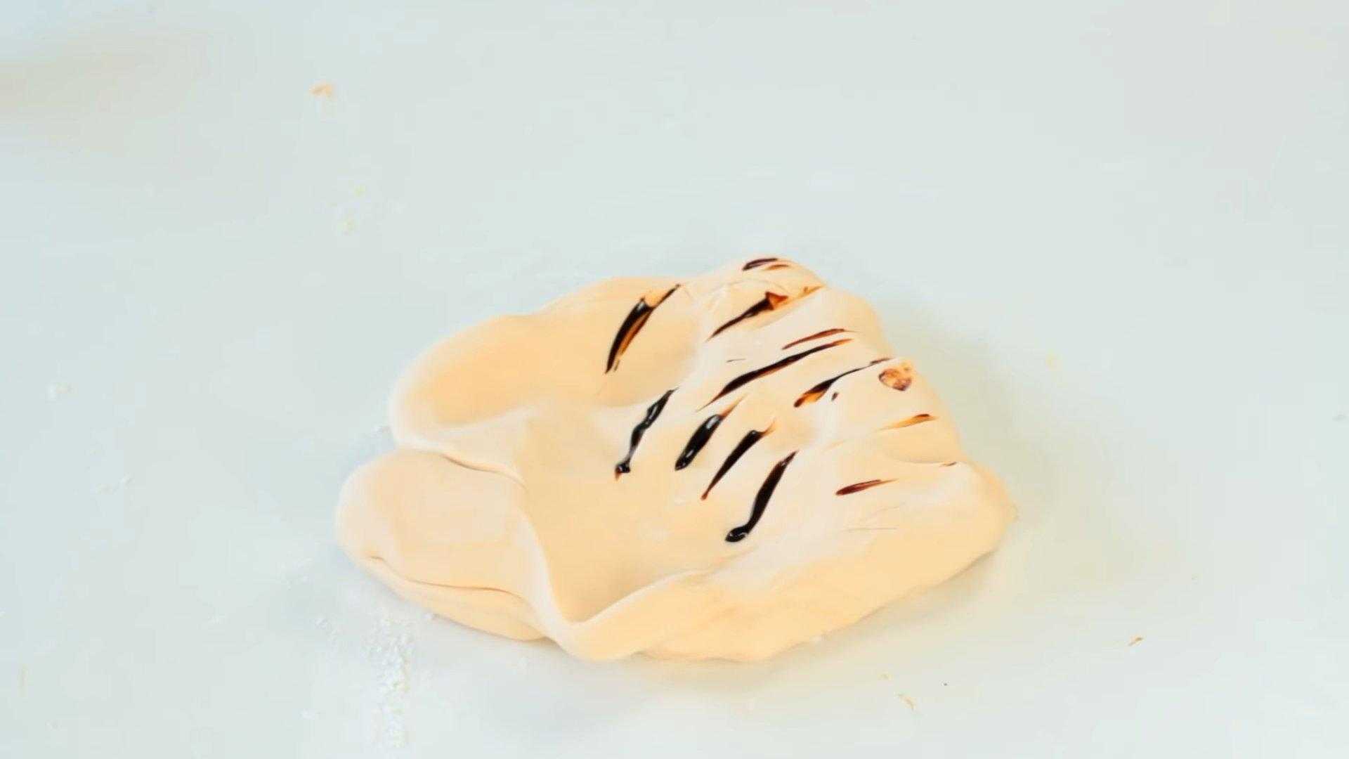 Белую мастику окрашиваем пищевым красителем в телесный цвет и лепим из нее «извилины» мозга.