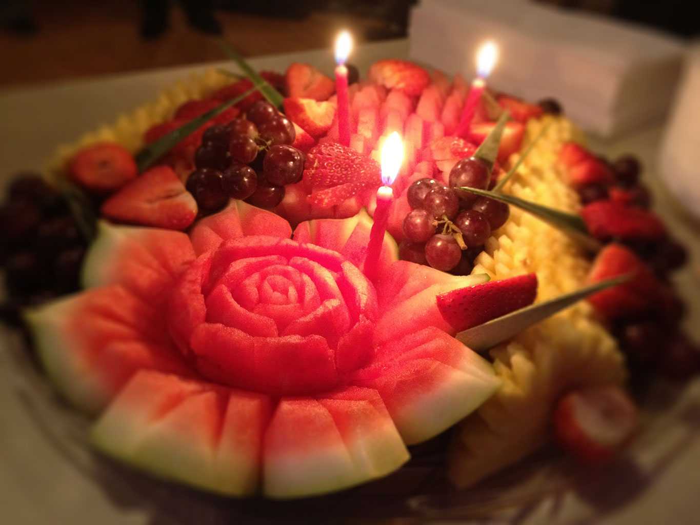 Сложным способом декорирования тортов фруктами считается карвинг – фигурная вырезка. Однако данная техника по силам даже начинающим мастерам. Главное, нарезать фрукты в определенной последовательности тонким ножом.