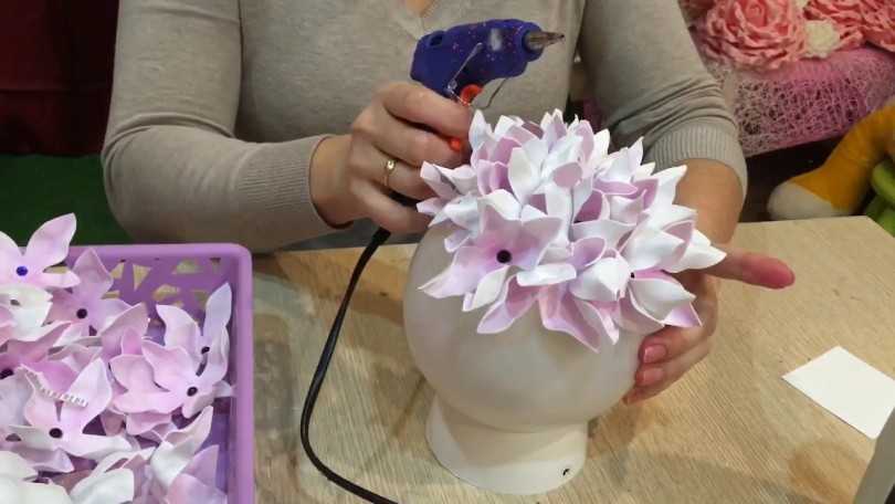 2. ПриклеиваниеПосле того, как каждому лепестку была придана новая изогнутая форма с волнистыми краями, можно приступать к процессу приклеивания.Разогреваем клеевой пистолет или берем клей сильной фиксации.Ближе к «срезанной» части лепестка наносим немного клеевого состава и начинаем формировать цветочный бутон. В центр бутона можно поместить небольшой шарик-основу, скатанный из фольги ил другого подходящего материала.Приклеиваем фиолетовые лепестки один поверх другого, плотно прижимая их друг к другу. С клеевым пистолетом дело пойдет быстрее, с «холодными» видами клея процесс может немного затянуться.