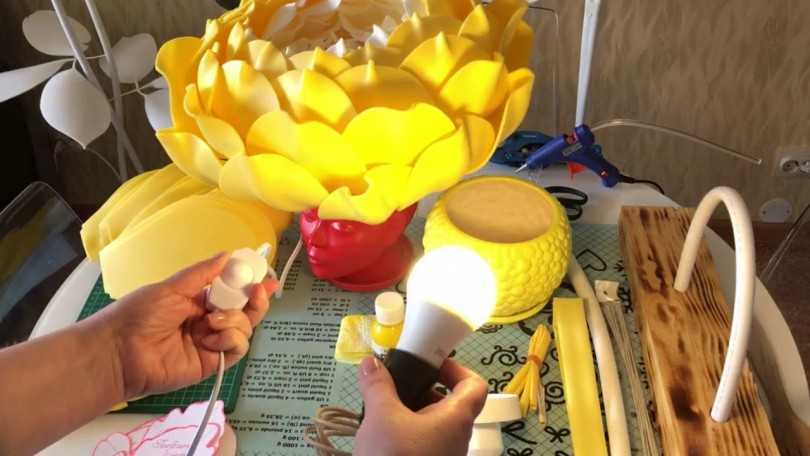 Этот вариант подходит всем тем, кому пора обновить лампу, или, если хочется соорудить оригинальный абажур. Роза из фоамирана будет одна, но она будет большой. Тогда основание под светильник можно оформить, как стебель розы
