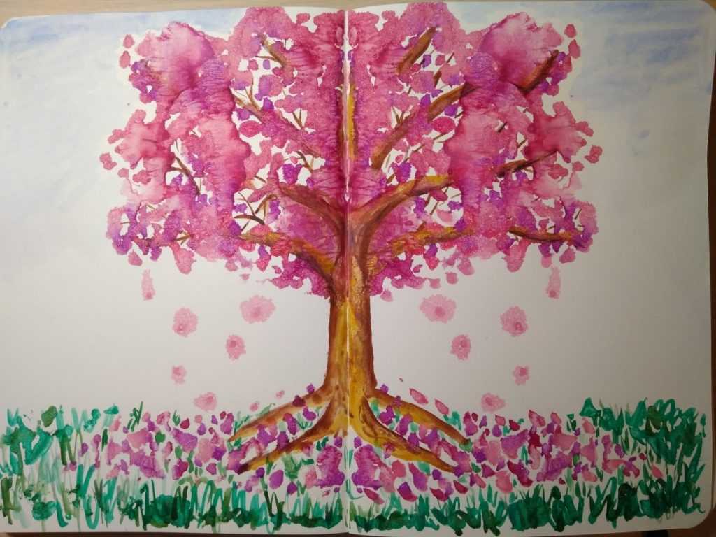 - На одной половине что-нибудь нарисуйте, к примеру, половину дерева.