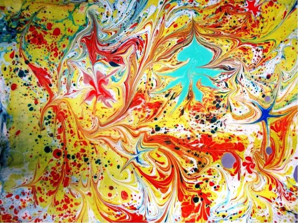 - Акваграфия: нерастворимую краску в жидком виде медленно добавляют в емкость с водой. На поверхности получатся цветные пигменты, которые необходимо размешать кисточкой, создавая интересные узоры. Затем в емкость с цветной водой помещают лист бумаги, чтобы сделать отпечаток узора, и аккуратно вынимают его. Кстати, такой способ изображения рисунка появился в 15 веке. В Турции и Персии акваграфию называли эбру («искусство облаков»):