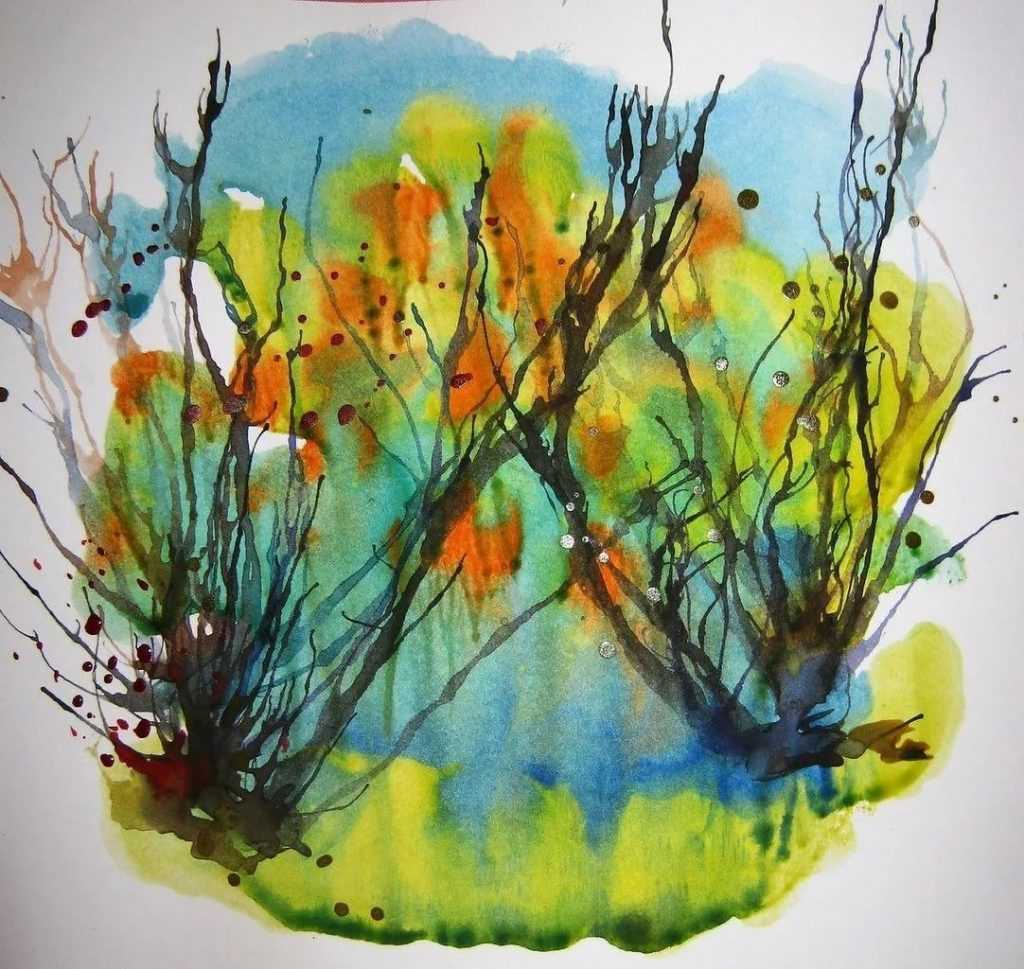 - Акватипия: картинка наносится гуашью, а после свободные от краски места закрашивают черной тушью. Далее раскрашенный лист необходимо высушить, а потом поместить в емкость с водой. Тушь в воде не растворяется, а гуашь – частично. В результате получается оригинальное размытое изображение: