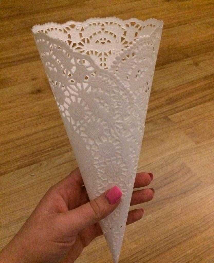 Шаг 4. Край ажурной салфетки прикладывают к вершине конуса, оборачивая его со всех сторон. Готовое платье ангела аккуратно приклеивают к картону, стараясь детально обработать места стыков.