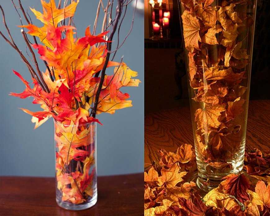 Можно оригинально украсить входную дверь, повесив на нее веночек из кленовых листьев. Делается он просто по аналогии с другими венками