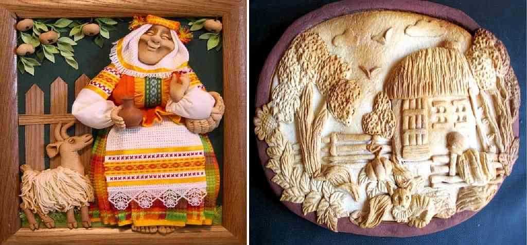 Используя солёное тесто, можно создавать самые яркие и необычные образы: фигурки для украшения настенных часов, любимой кружки под чай и кофе, сувениры на каминную полку. Очень популярны новогодние поделки, выполненные из солёного теста своими руками.