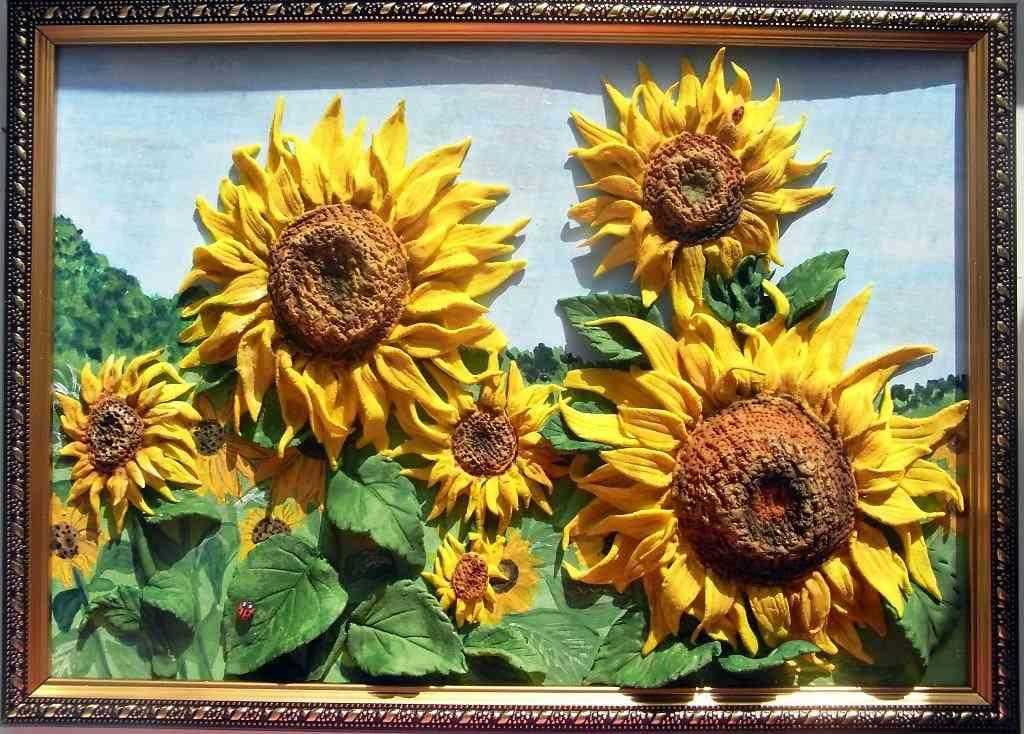 На лист ДВП наносится ПВА, смешанный с белой гуашью, чтобы исключить желтизну. Для изготовления подсолнухов понадобится окрашенные четыре части теста – желтого, зеленого, черного и красного цвета. Последний оттенок – для декора подсолнухов божьими коровками. Чтобы выполнять лепку было легче, лучше сделать бумажный эскиз всех частей рисунка. Прикладывая их к раскатанному пласту, вырезать формы – цветы, литься. Стебли скатать из теста и прикрепить к основе. Выше уже было сказано, что для эластичности следует добавить в тесто крахмал. Растягивать массу при изготовлении стебля нельзя. Во время высушивания это приведет к трещинам. Структура листьев делается зубочисткой.