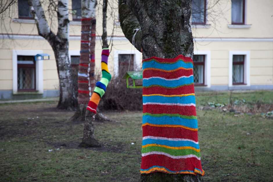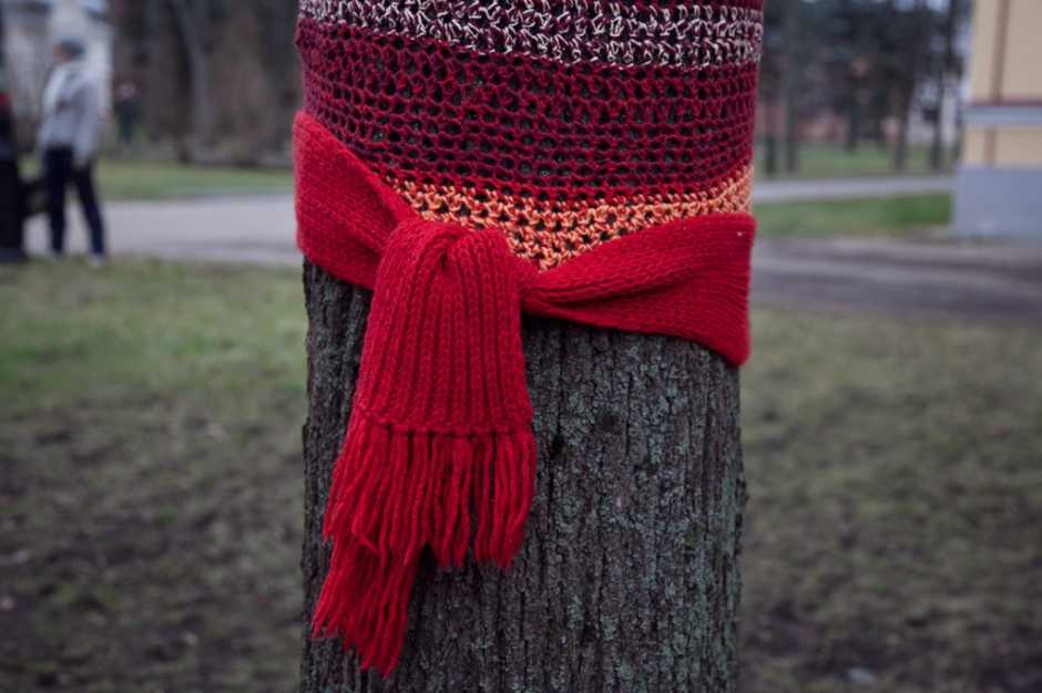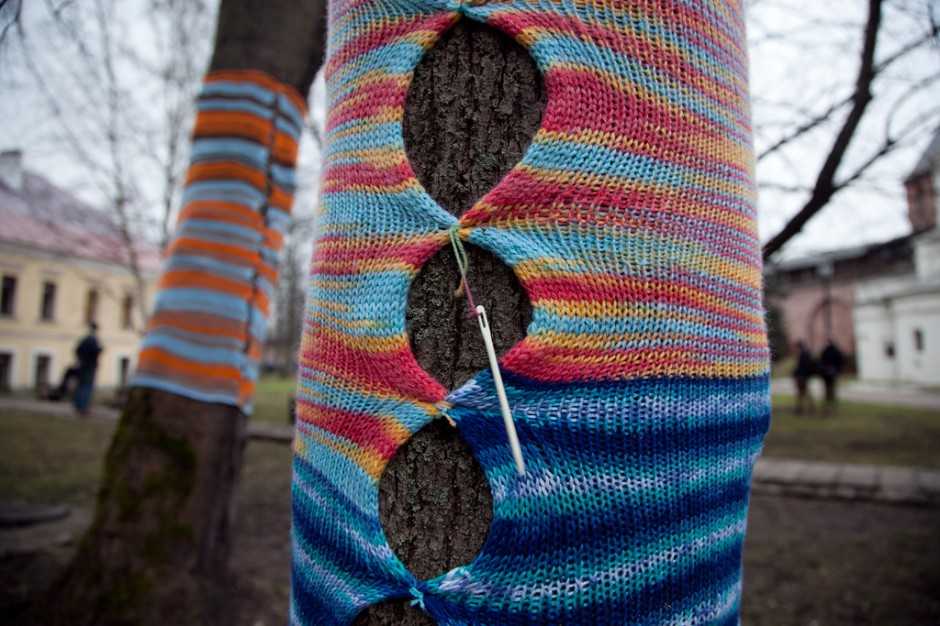 - Самые популярные проекты ярнбомбинга – это вязаные чехлы для деревьев. Так деревья утепляются на зиму, при этом дышат. Обвязываются не только стволы, но даже веточки.