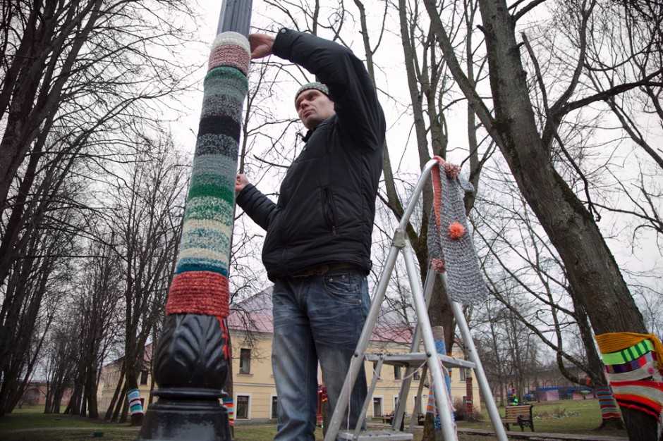 Не остался без внимания и фонарный столб. Многие шарфы дали «вторую жизнь» старым свитерам и завалявшейся пряже.