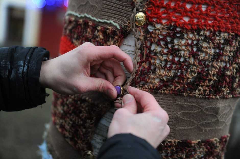 В субботу, 28 декабря, «Новый город» и сочувствующие одевали, украшали и утепляли деревья в кремле. Яркие шарфы-полотна сшили и связали новгородцы своими руками для акции «Одежду деревьям!». Впрочем, один из шарфов прибыл к нам из Краснодара, его специально изготовили для акции и прислали по почте.