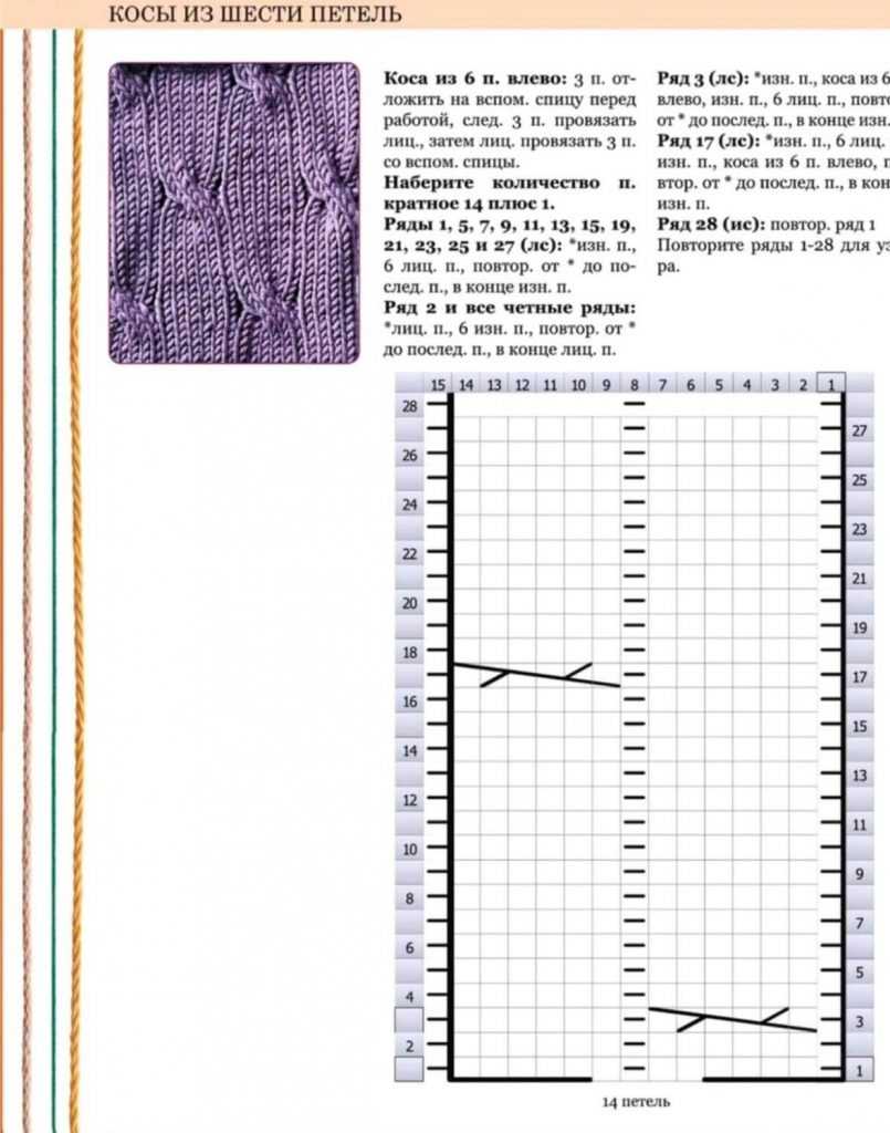 Вот этот рисунок тоже хорош для шарфа или снуда, отличие от нашей первой схемы – косы немного уже (не 4, а 3 п.). Вязать по рисунку – значит, если спицы круговые – чётные р. – лицевыми, а если спицы простые, чётный р. – изн!
