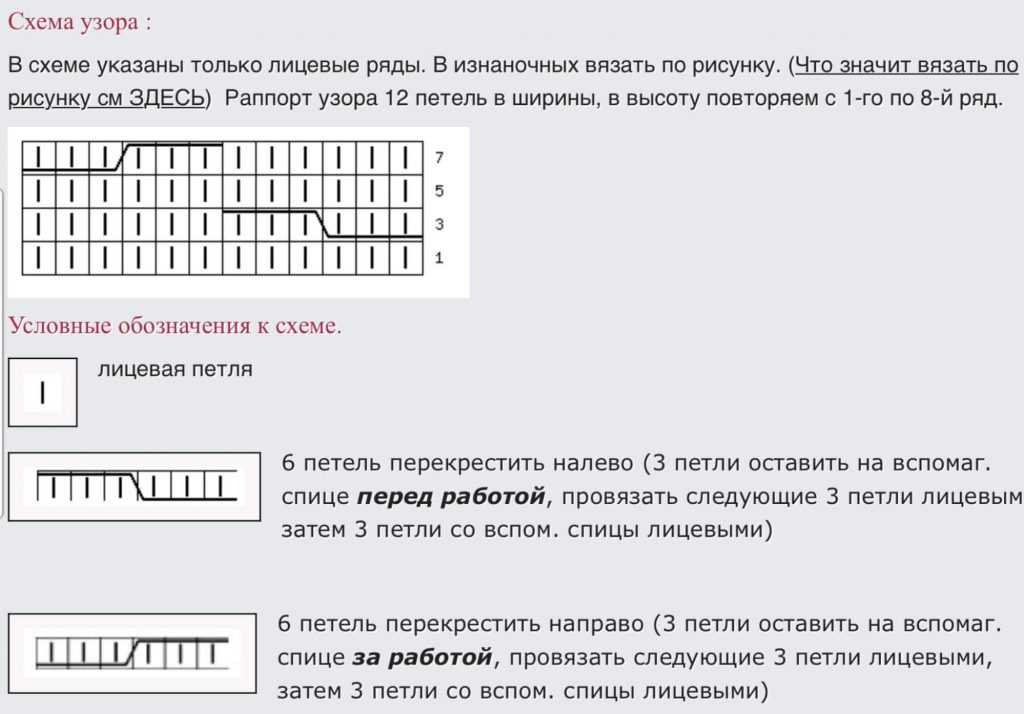 1-й р. убавок: 2 лиц., *2 вм. лиц., (3 п. перенести на вспом. спицу за работой, 3 лиц., 3 п. со вспом. спицы лиц.), 2 вм. лиц.*, от *до * повтор до конца ряда. 2-й р.: лицевыми без убавок. 3-й р.: перехлёсты делать не 3/3, а 2/2 п. 4-й р.:лиц. без убавок. 5-й: *2 лиц, 2 вм. лиц* – до конца р. 6-й: как 5-й.