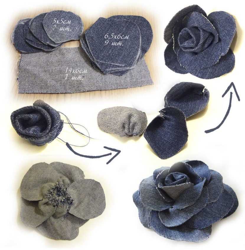 Если вы проявите немного терпения, то сможете сделать из старых джинсов, красивый цветок который можно будет использовать для украшения одежды, интерьера или изготовления заколок, ободков, чокеров и брошей. Самый простой способ сделать такую поделку, отрезать кусок ткани от джинсов, разложить ее на столе, а затем при помощи картонного трафарета вырезать заготовки разной величины, имитирующие цветок.