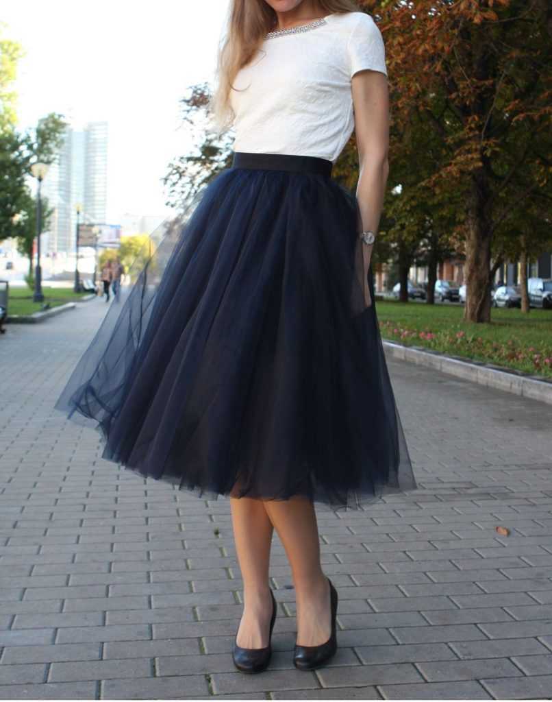 Самым оптимальным вариантом можно считать именно черную пышную юбку, поскольку она имеет одновременно нотку и женственности и дерзости. Довольно неплохо они работают с кожаными корсетами, высокими чулками и украшениями из камней. Можно также примерять, под черную пышную юбку, различные топики и майки со стразами. Кстати, подобные юбки предпочитают иметь в своем арсенале любительницы рока и различных субкультур.