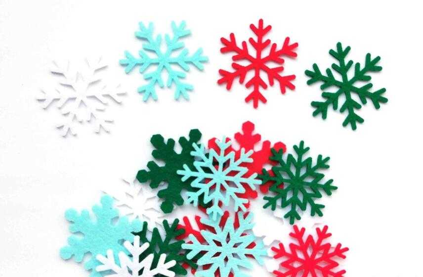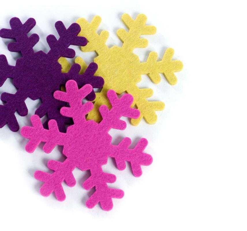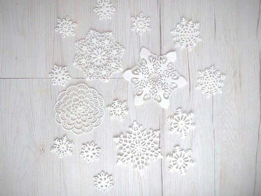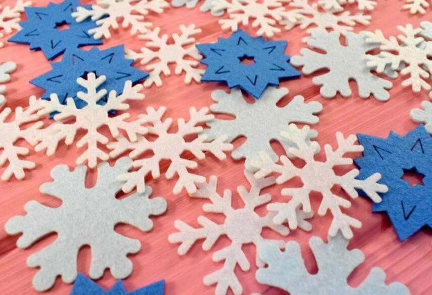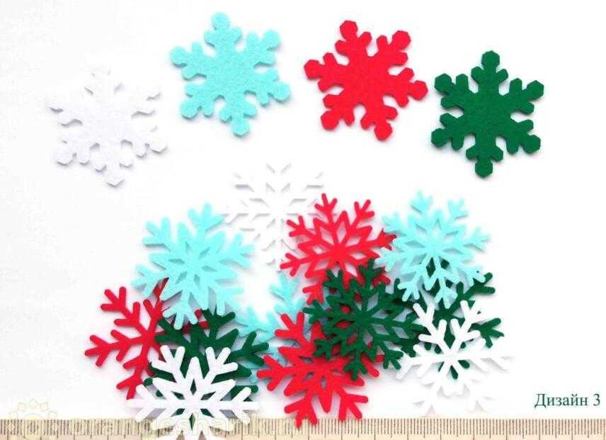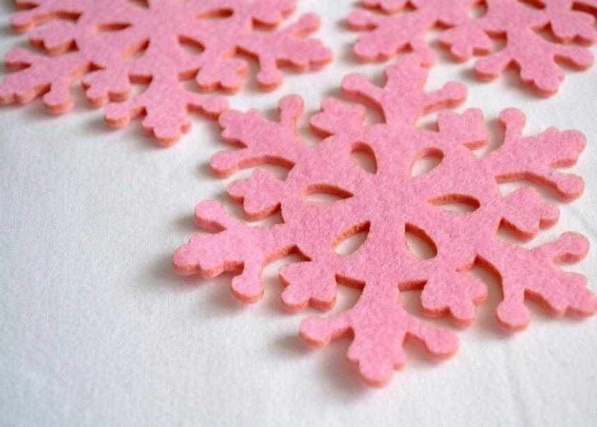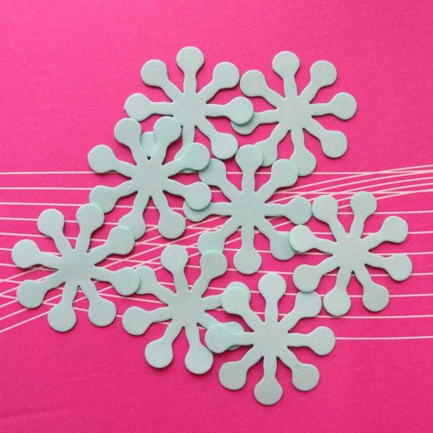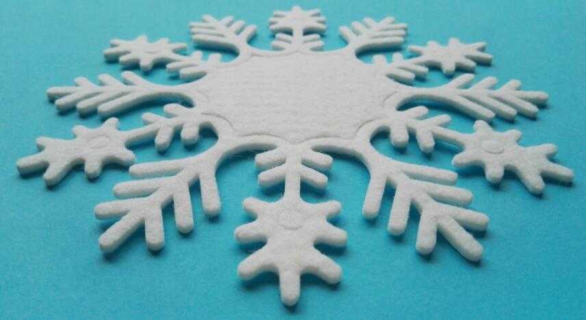 Затем выкройку необходимо перенести на лист фоамирана. Для красивой объемной снежинки нужно не менее 4 слоев лепестков. Но многое зависит и от размера самой снежинки. Если вы делаете ее очень маленькой (миниатюрной), возможно вам хватит и два — три слоя. А если она будет размером с ладонь и более, нужно будет увеличить количество ярусов. Кроме того, можно продумать и различный размер слоев, начиная собирать снежинку с самых крупных элементов и заканчивая самыми маленькими.