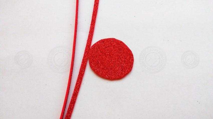 4. Сделайте 6 лучиков одинаковыми. Теперь у вас 6 ромбов, внутри каждого из них виднеются отверстия. 5. Для украшения лучиков и серединки, а также крепления подготовьте красные детали из глиттерного фоамирана. Вырежьте круг и несколько тонких полос, ширина полос примерно 3-4 мм.