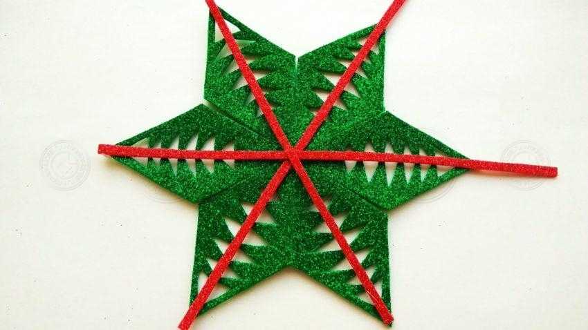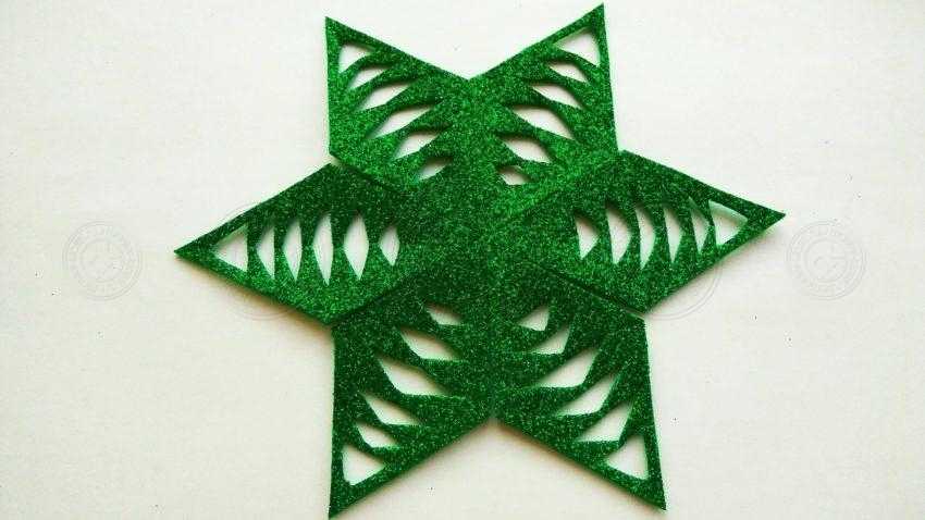9. Снежинка из глиттерного фоамирана готова. Она яркая, комбинация цветов контрастная и отвечает новогодней тематике, поскольку лучики резные и зеленые, то модель действительно напоминает елочку. Мы добились нужного результата. На этом урок можно закончить. Если вы посмотрите на фигуру с обратной стороны, то она также будет смотреться интересно, только поверхность будет матовой, а не блестящей. Останется любоваться вашей поделкой и украсить ею интерьер. Новогодние эксперименты самые яркие и запоминающиеся для детей.
