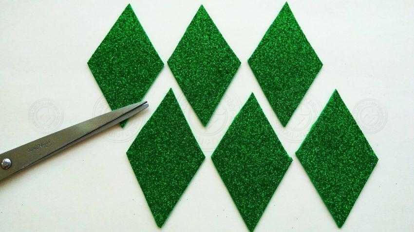 1. Подготовьте зеленый фоамиран, из которого будут выполнены лучики снежинки. Из картона вырежьте ромб и 2 противоположных угла в нем сделайте в 60 градусов.