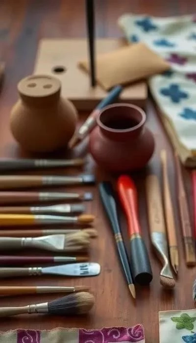 Для нанесения воска используются специальные инструменты: чанты (резервуары для расплавленного воска), аппликаторы (для нанесения воска тонкими линиями), кисти (для нанесения воска на большие площади). Для нанесения красок используются кисти различных размеров и форм, а также губки, штампы и трафареты. Выбор инструмента зависит от техники батика и желаемого эффекта.