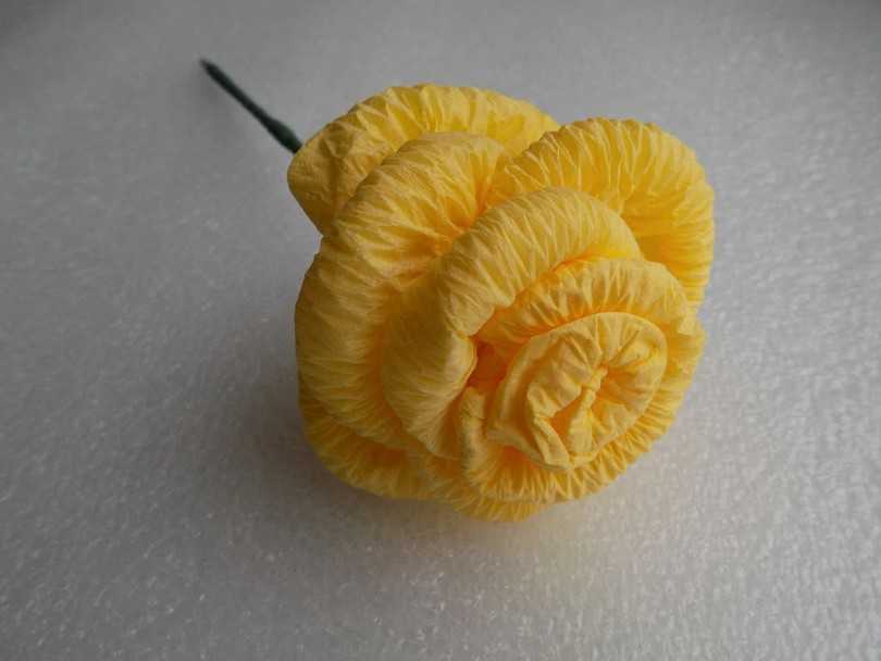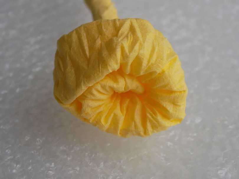 Свободный материал у основания нужно немного сжать и подкрутить. На последнем этапе достаточно пальцами слегка распушить лепестки образовавшегося бутона, выворачивая их наружу. Так можно поступить и с верхними слоями бумажного бутона, чтобы он казаться гораздо пышнее и легче.