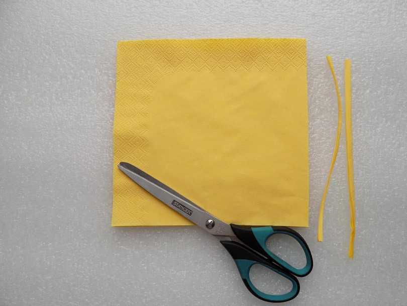 - Чтобы сделать одуванчик вам нужны будут желтые салфетки. Возьмите несколько салфеток и разрежьте их на небольшие квадраты. После квадраты нужно сколоть по центру степлером и сделать из них круг.