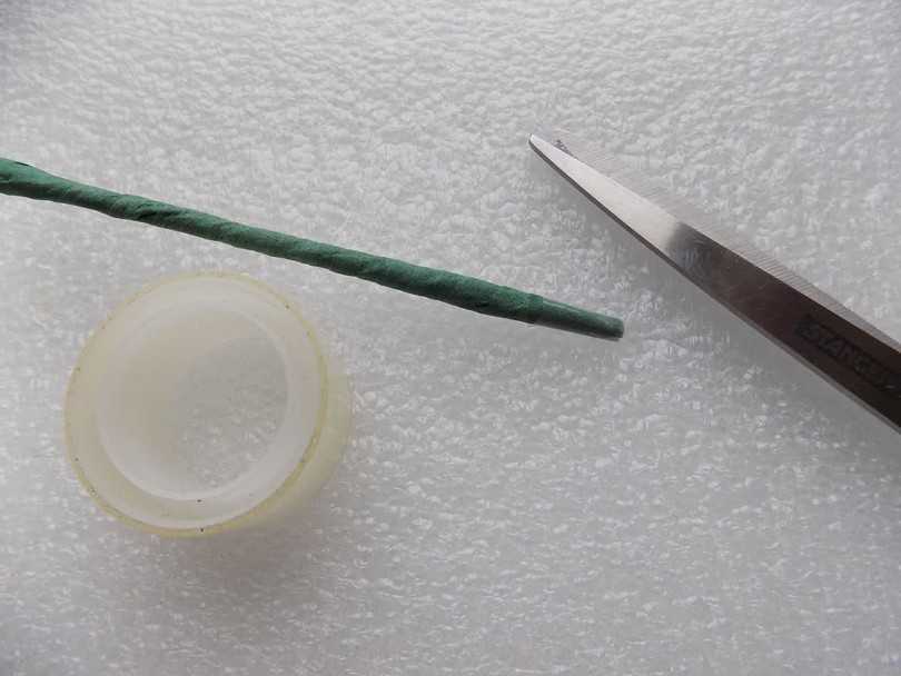 Полоску смазываем клеем, оборачиваем вокруг низа цветка и ватной палочки (кончик можно обрезать). В качестве стебелька идеально подойдет пластмассовый стебель от магазинного цветка