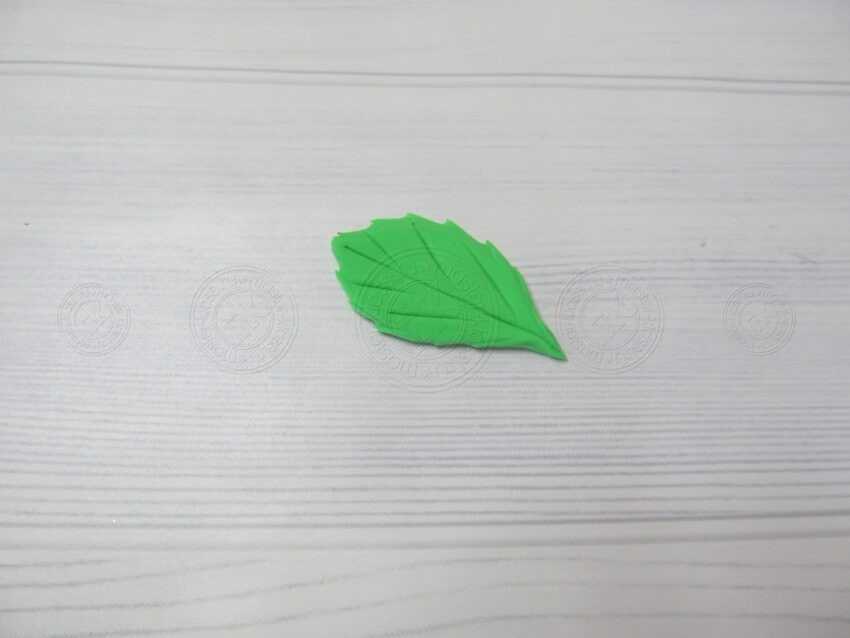 - Из зеленого пластилина вылепляем листья, стеком делаем резные края и выделяем прожилки. Верхнюю часть заостряем пальцами. Делаем 3-4 заготовки.