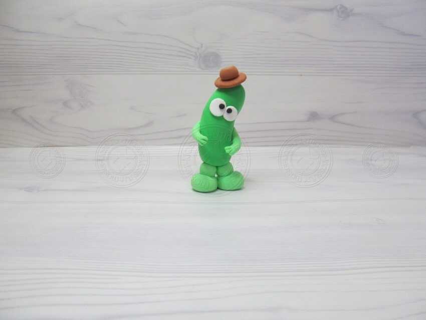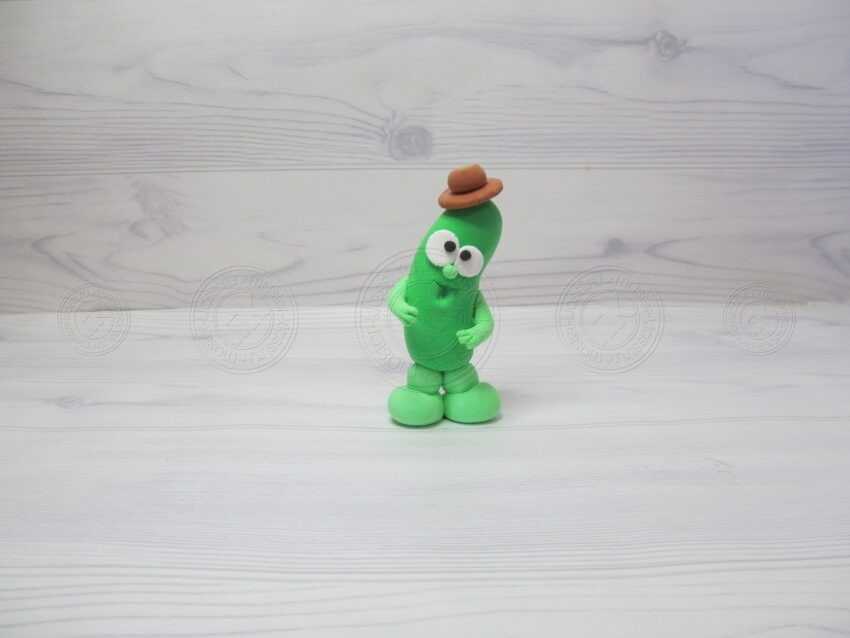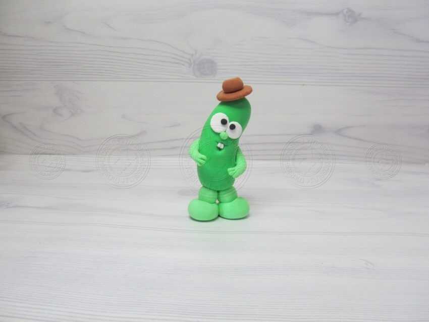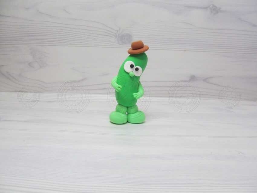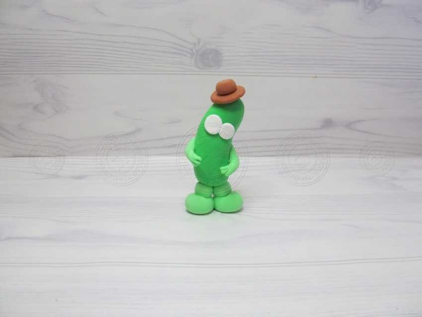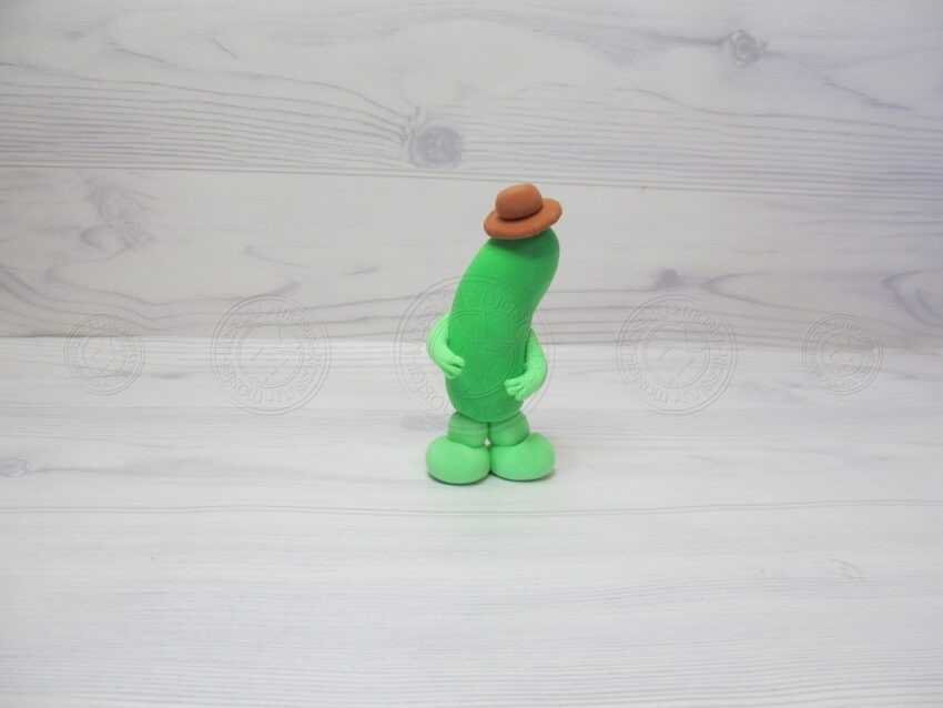 10. Прикрепляем полученные руки к огурцу примерно на середине, придавая им изогнутую форму тела.