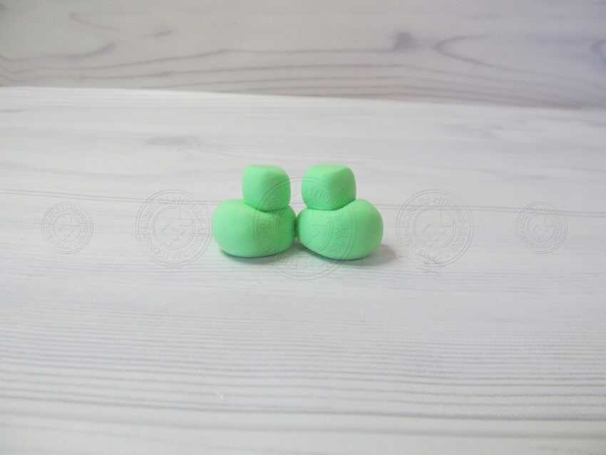 8. Далее снова возьмем еще немного материала, но уже меньшего размера и сделаем из него два квадрата, с ровными гранями. Превратите ранее полученные шарики в яйцевидную форму и нажмите на один из концов. Соедините две конструкции, как это сделано у нас.