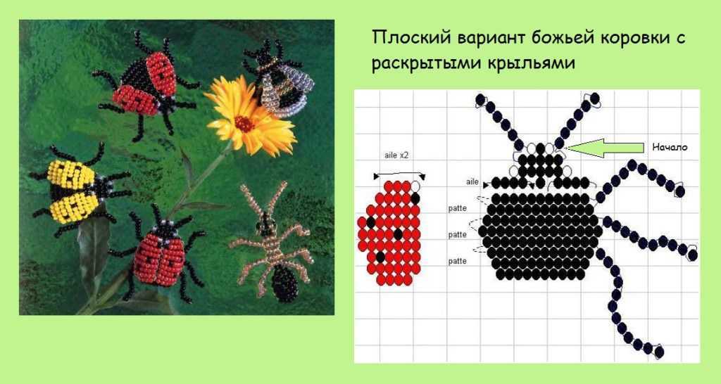 Есть различные методы плетения этой коровки. Для многообразия даже можно создать приплюснутый образец «божьего» творения с распахнутыми крылышками. Сначала нужно будет изготовить усики, применяя бисер, потом голову коровки, как в последнем мастерстве, сплести ряд за рядом лапки, а также тело. Теперь следует произвести пару равноудаленных крыльев из бисера, чтобы прочно прикрепить их на тельце «божьей» красавицы.