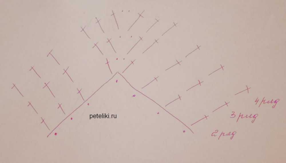 Далее, продолжаем вязание по аналогии с первым рядом. Только теперь два столбика с накидом с воздушной петлей вяжем в галочку. В каждом ряде будет прибавлять по четыре петли.