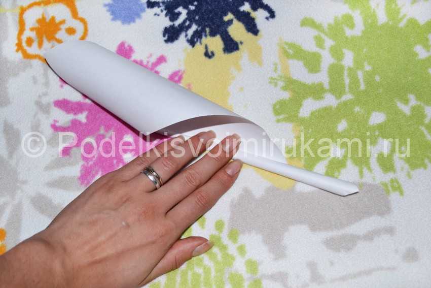 Этот кулек мы и будем формировать на следующем этапе, скручивая бумагу таким образом, чтобы с одного конца трубочка была зауженной, а с другого — расширенной.