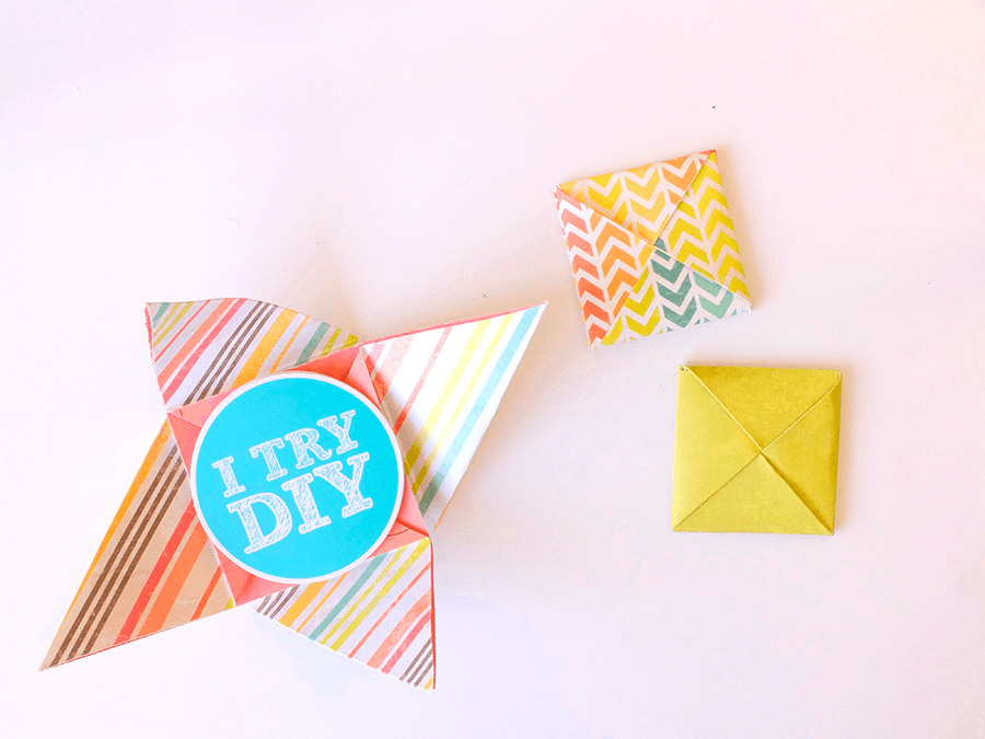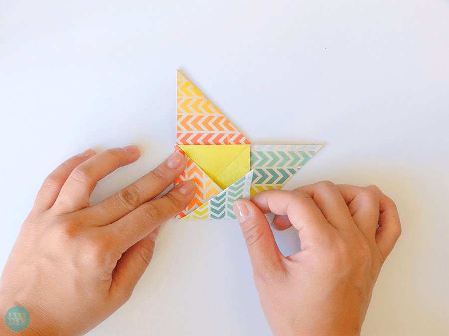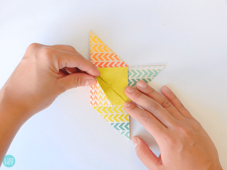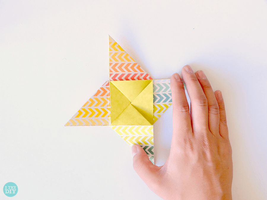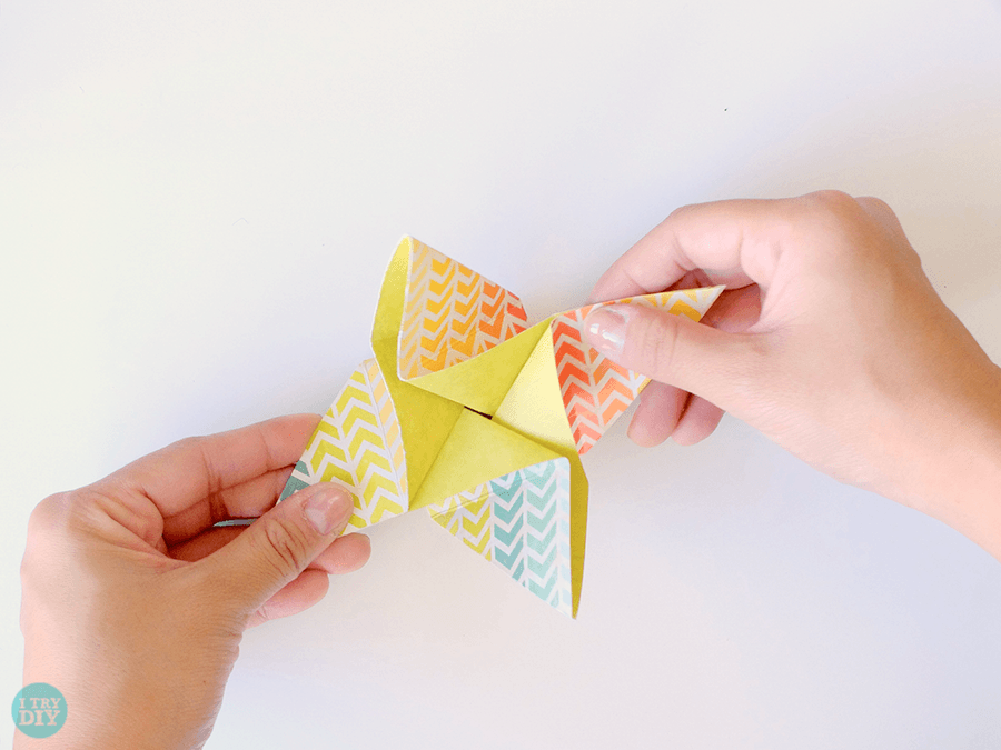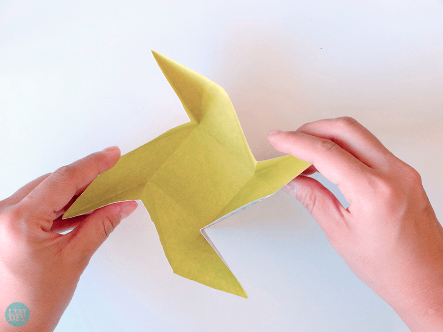 Если вы внимательно посмотрите, вы увидите перед собой поделку в форме вертушки со складками. Вам это нужно иметь в виду для следующих действий.