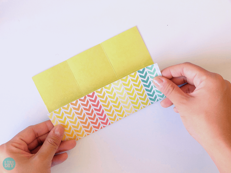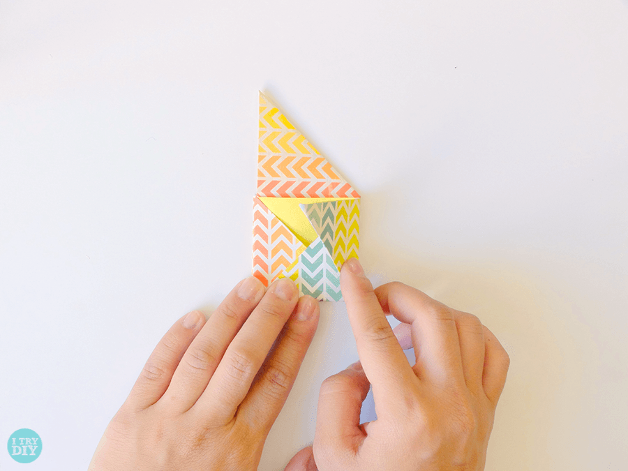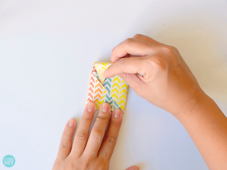 - Складываем нижнюю часть, как это обычно делают у конвертов, а центральный клапан заводим внутрь – он служит фиксатором, чтобы бумажная конструкция не распадалась. При желании, можно приклеить деталь, но это совсем не обязательно.