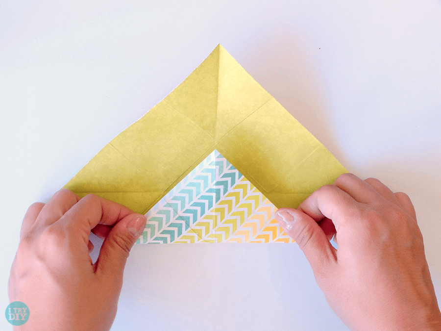 Сложите залом внутрь по ранее сформированным складкам. Вы сейчас можете увидеть, как вам пригодились миниатюрные боковые загибы.