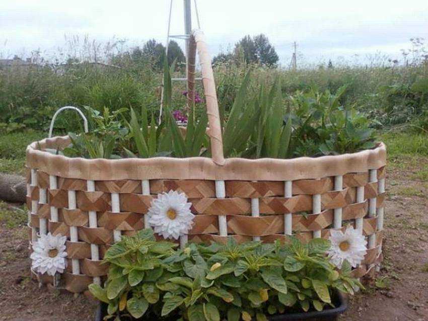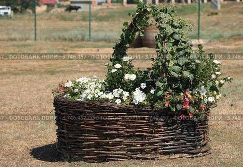 Если планируете засадить клумбу-корзину вьющимися растениями, сделайте для них опору. Визуально это будет как корзина с ручкой. Получится высокая плетеная конструкция в человеческий рост, будет очень красиво смотреться, если поставить у крыльцаили или калитки на входе во двор.