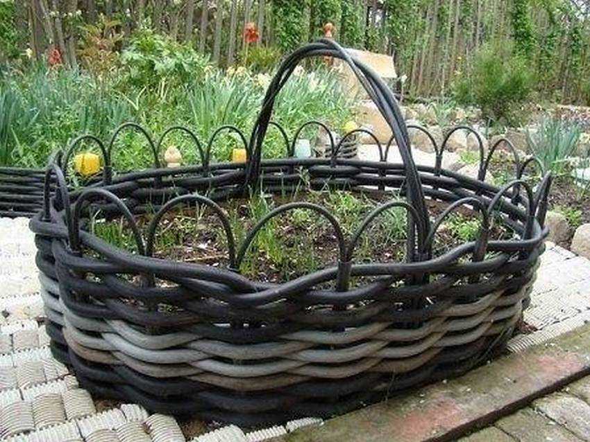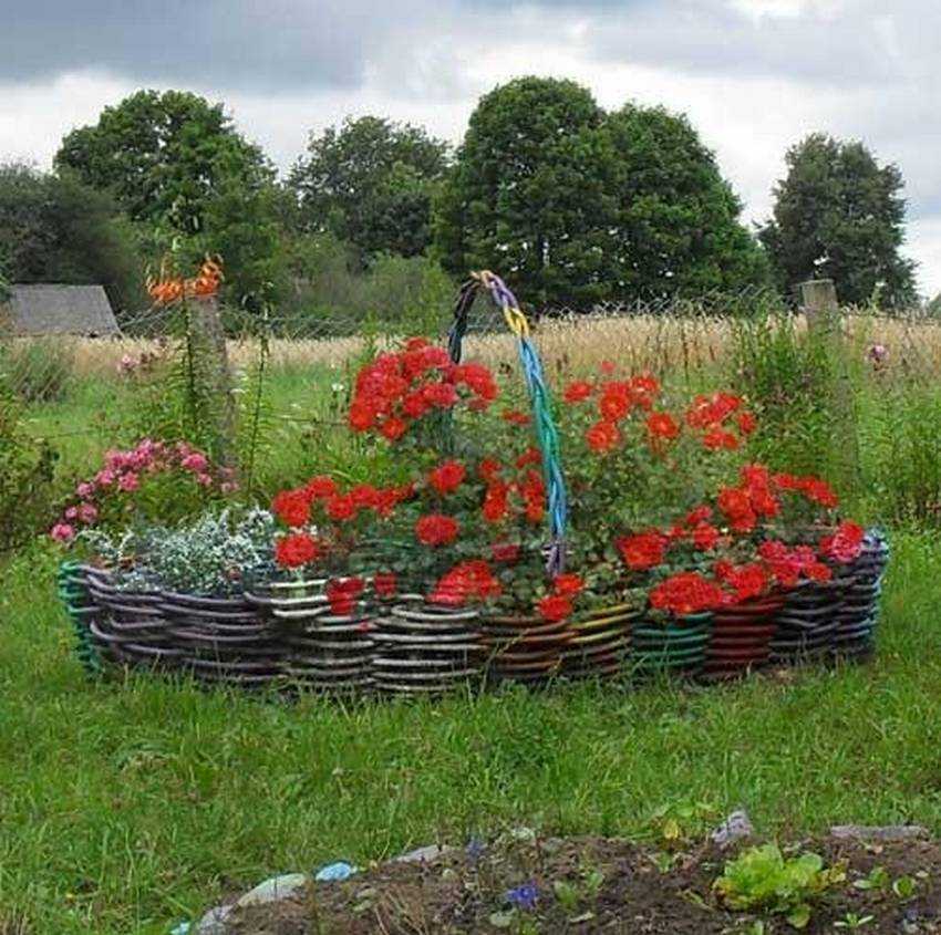 Такая садовая композиция в виде корзины — это красиво, броско, и при этом гармонично, так как сама идея корзины сочетается с любыми растениями и любым вариантом оформления сада. Многие садоводы высаживают цветы в старые корзины. Но чтобы получить действительно стильный садовый аксессуар, просто старую, даже очень большую корзину использовать все же стоит – она будет слишком мала для настоящей клумбы, и будет при этом выглядеть слишком тривиально. Лучше «сплести» стилизованную корзину самостоятельно! Тем более что это совсем несложно. А затраты? Практически никаких, поскольку все для изготовления клумбы-корзины наверняка найдется на вашей даче.