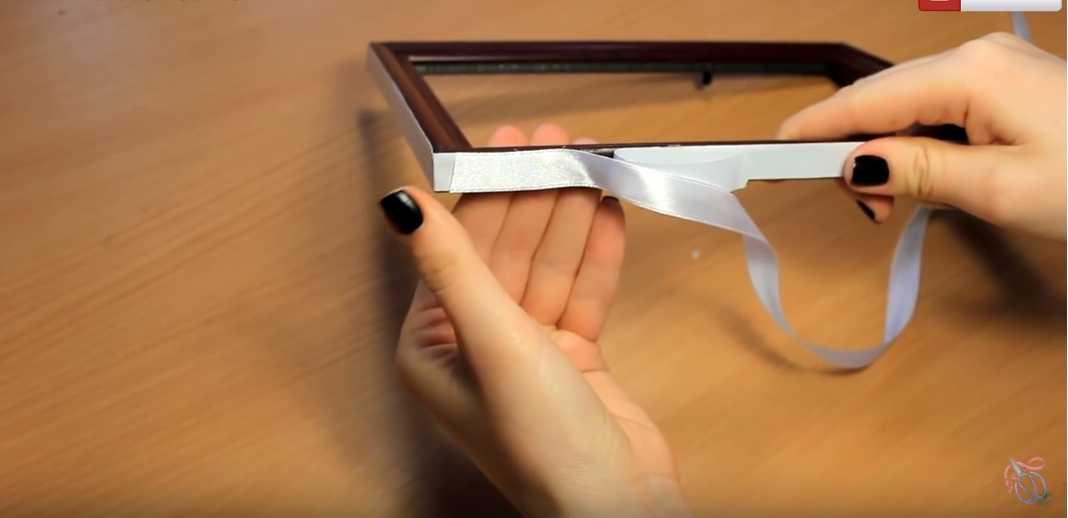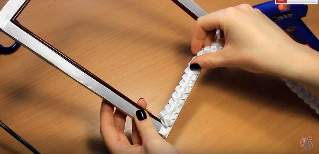 Дополнительно украсить ее можно с помощью плетеной косички из атласных лент. Для этого понадобятся тонкие ленты шириной 5 мм. Для оплетения рамки 20 на 15 см нужно в общей сложности 7 м.
