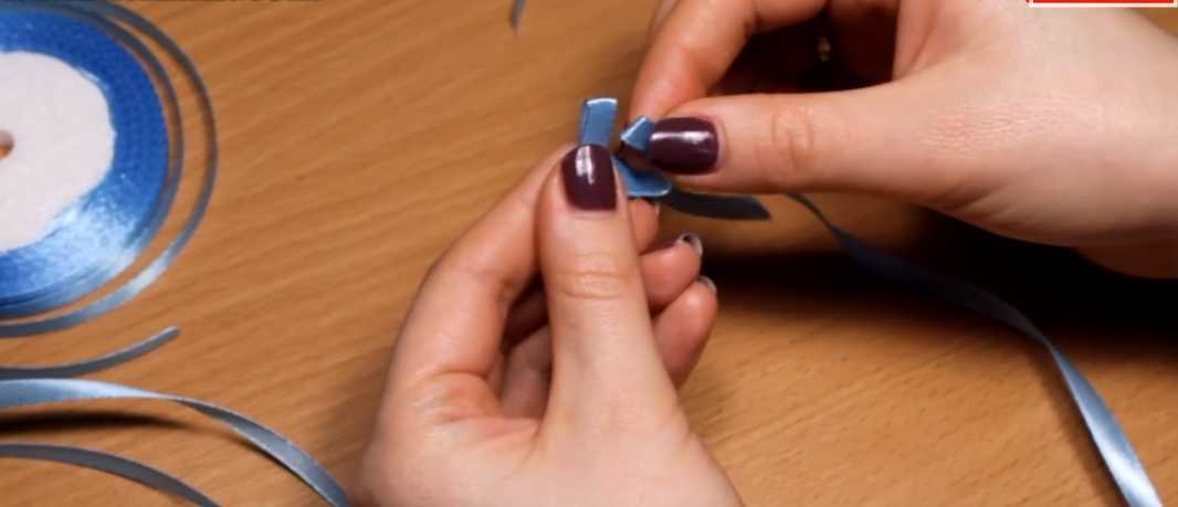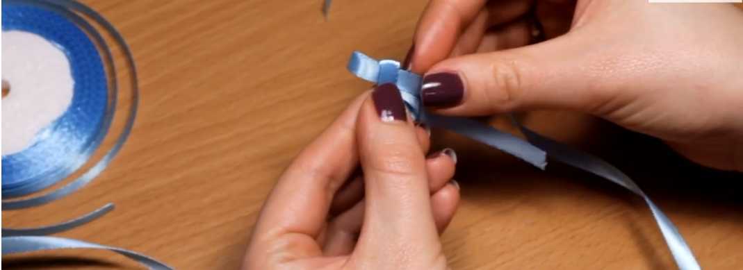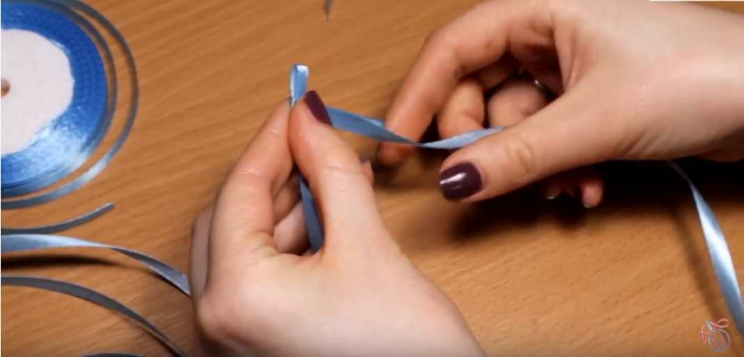 Работаем с длинными концами лент. Длинный конец нижней ленты сворачиваем в петельку и вкладываем в верхнюю петлю. Так же поступаем с другим концом. Повторяем до нужной длины. Для наглядности воспользуйтесь мастер-классами на видео.