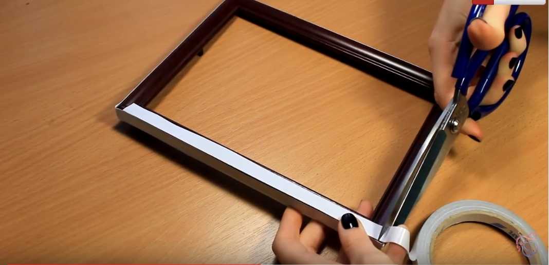 Обклеиваем рамку двусторонним скотчем. Закрепляем один конец тонкой ленты, снимаем все слои скотча и фиксируем ленту на липком слое. Тщательно проглаживайте неровности, чтобы работа выглядела аккуратно.