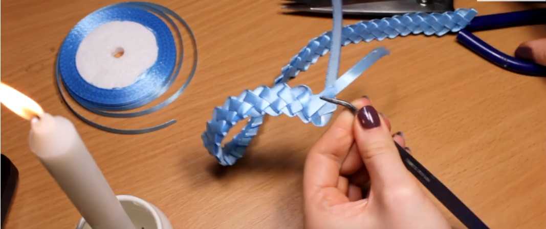 - Свеча. Нужна для обжигания краев лент. Иногда пользуются для этого зажигалкой или выжигателем, но они оставляют свободной только одну руку. Удобно работать с паяльником. Некоторые рукодельницы используют его для отрезания нужного кусочка ленты, обработки краев.