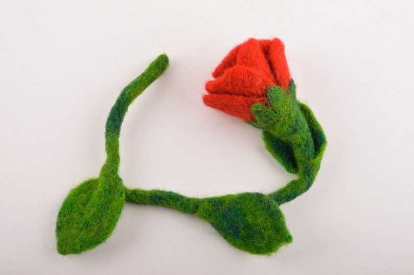 Цветы, сделанные таким оригинальным способом, станут замечательным подарком. Новичку потребуется от часа до трёх, чтобы опробовать данный вид рукоделия. Готовое изделие можно декорировать, украшать бисером, бусинами и лентами. Из валяных цветов получаются эксклюзивные украшения, например как брошь, заколка, декор пояса и сумки. Фантазируйте и творите красоту своими руками!