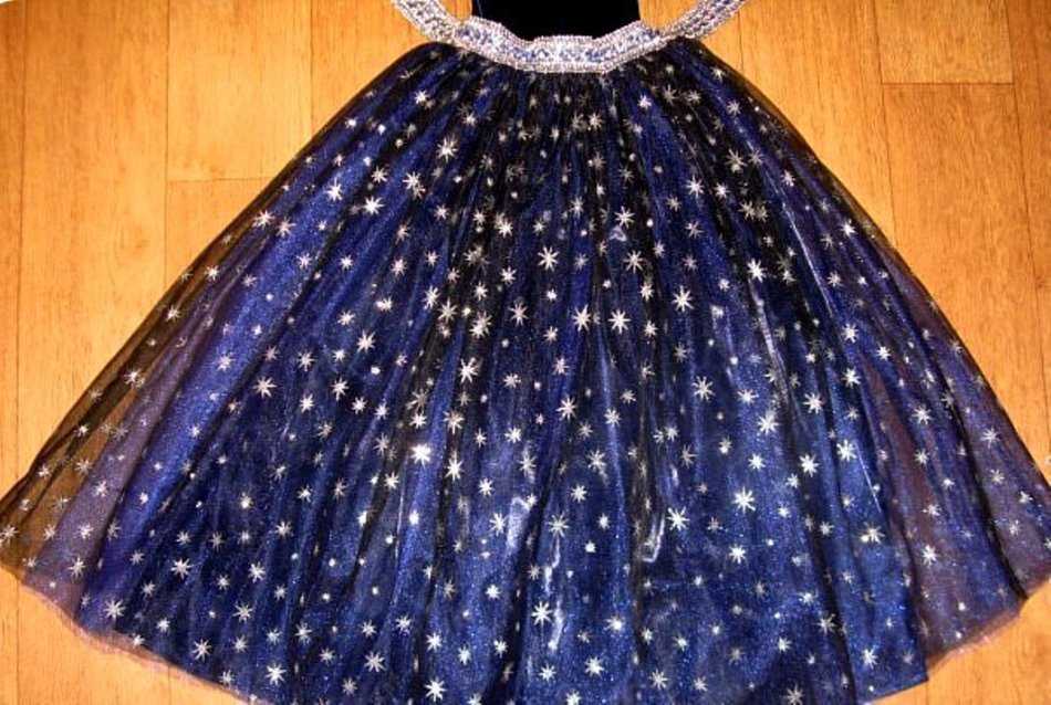 - 4 слой – длинная юбка из фатина или шифона со звездочками, длиной 100-120 см. Можно взять материю без узора, а звездочки вырезать из тонкой фольги, и прикрепить к готовой юбке.