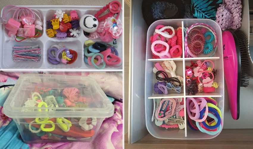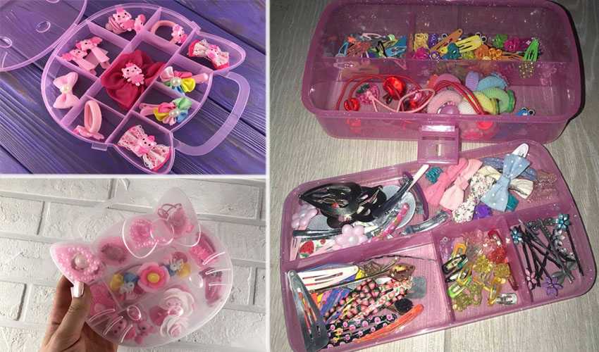- Хранение детских резинок и заколок в коробке – органайзере более удобно. В ней можно выделить отдельное место для каждого вида принадлежностей. А после использования отправить на полку шкафа. Если понадобится, такую коробку можно отнести в любое место.