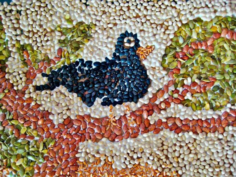 Крупа, бобы, зерна и семена бывают самых разных цветов, а это значит, что ими можно «написать» картину или сложить мозаичное панно. В зависимости от вашей задумки и художественных навыков, рисунок может быть более детализированным или очень схематичным.